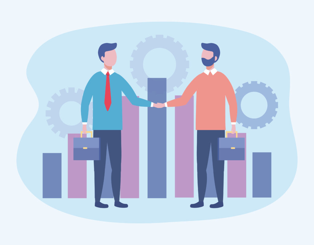 businessmen with suitcase and statistics bar and gears to teamwork strategy vector illustration